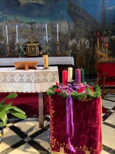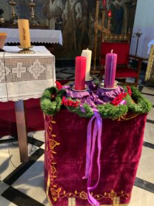 La hermana Luz, de las Siervas del Sagrado Corazón de Jesús, junto con un grupo de colaboradoras, han preparado la Corona de Adviento que, desde ayer, está en la Capilla del Carmen, y que nos acompañará en este tiempo litúrgico.