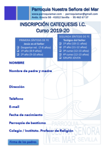 La próxima semana se abrirá el periodo de matriculación para las catequesis de Iniciación Cristiana, Grupo Joven y Catequesis de Adultos del curso 2019-20. Dicho periodo se extenderá desde el lunes 3 de junio, hasta el viernes 7 de junio, en horario de 18:00 a 20:00 de la tarde.